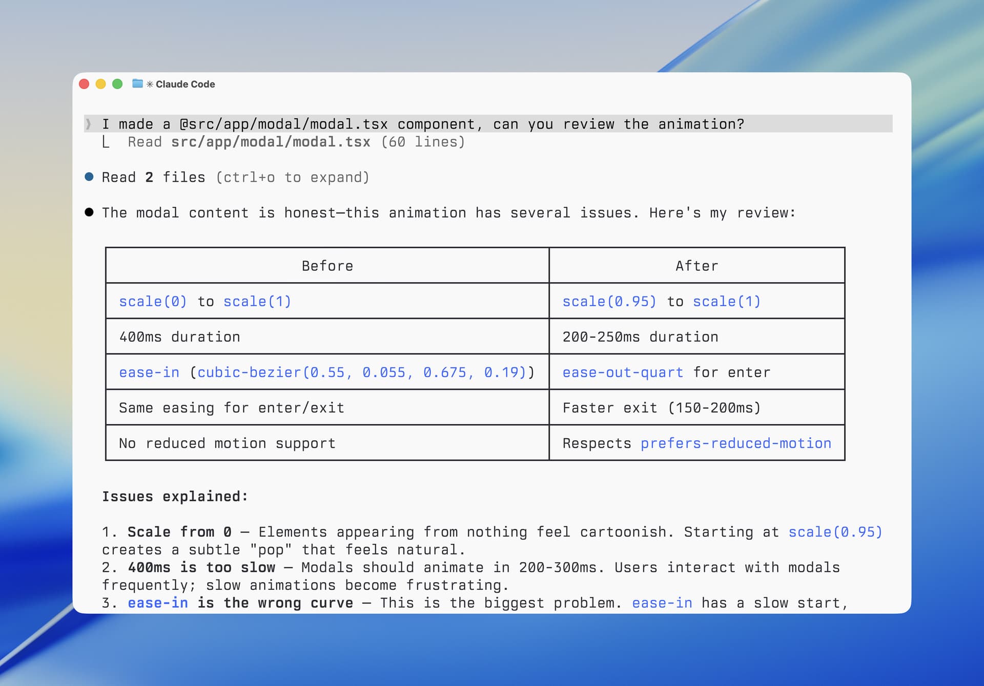 npx skills add emilkowalski/skillSupports Claude Code, Codex, Cursor, and more.I recommend using it on a case-by-case basis rather than having it always on. One example would be reviewing your animations: