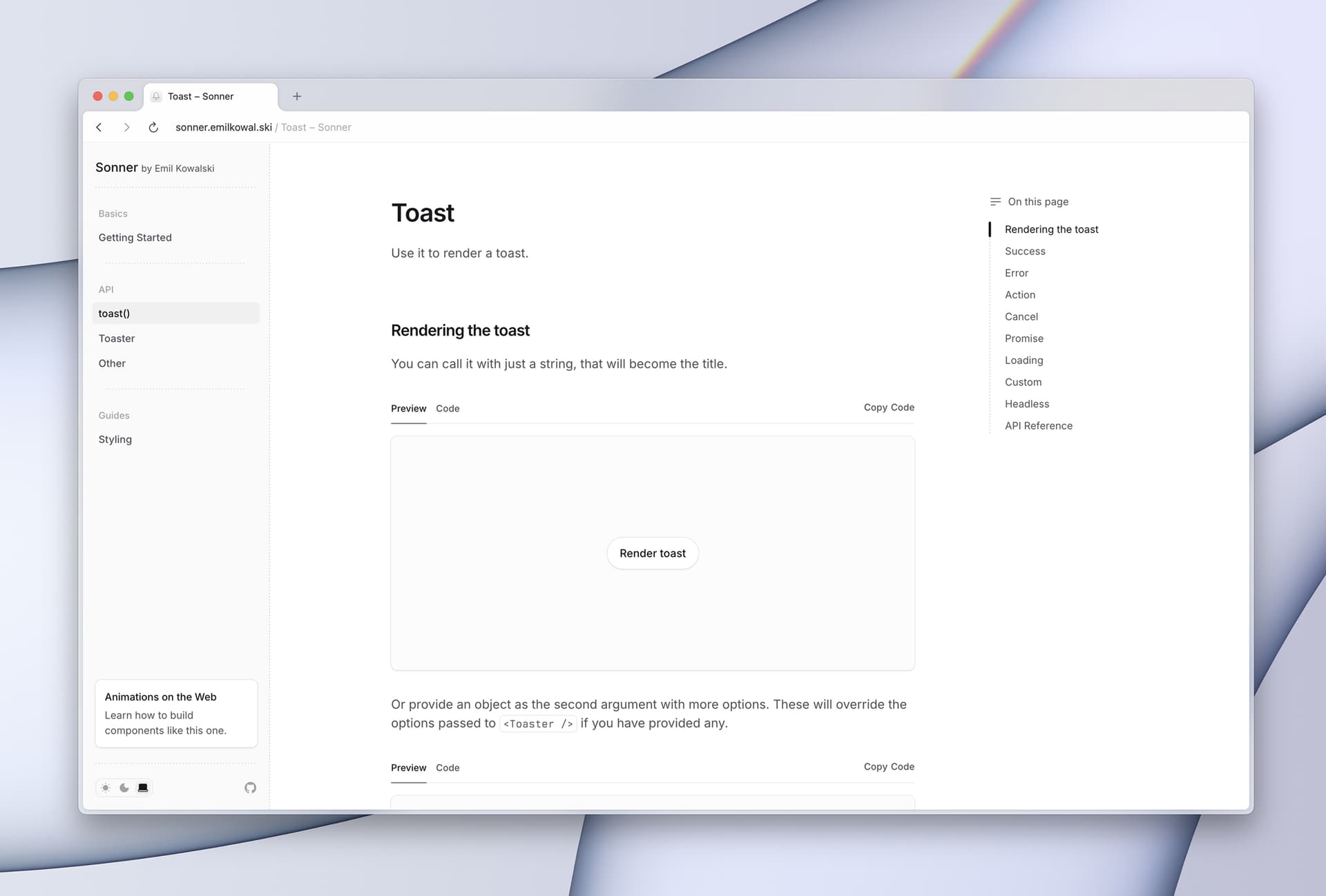 That’s why I built a fully custom documentation site for Sonner, where you can find lots of interactive examples with code snippets that are ready to be used.